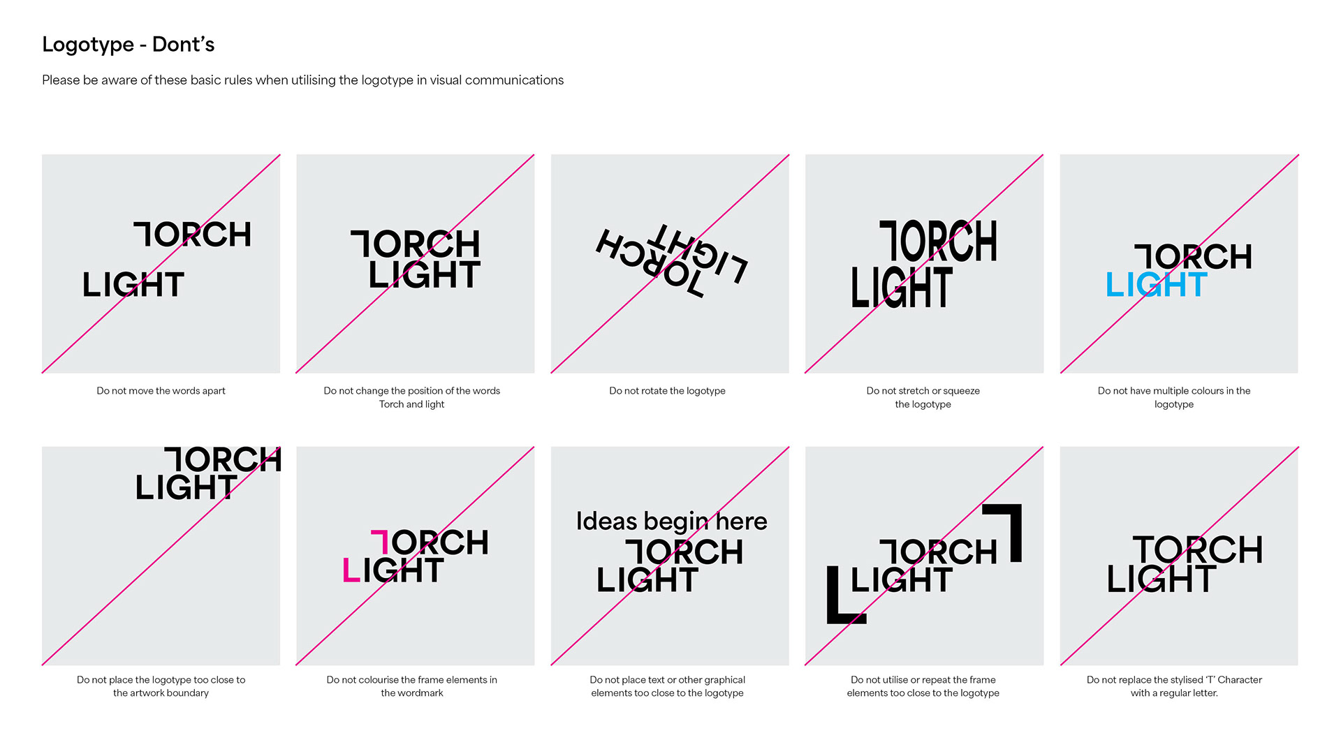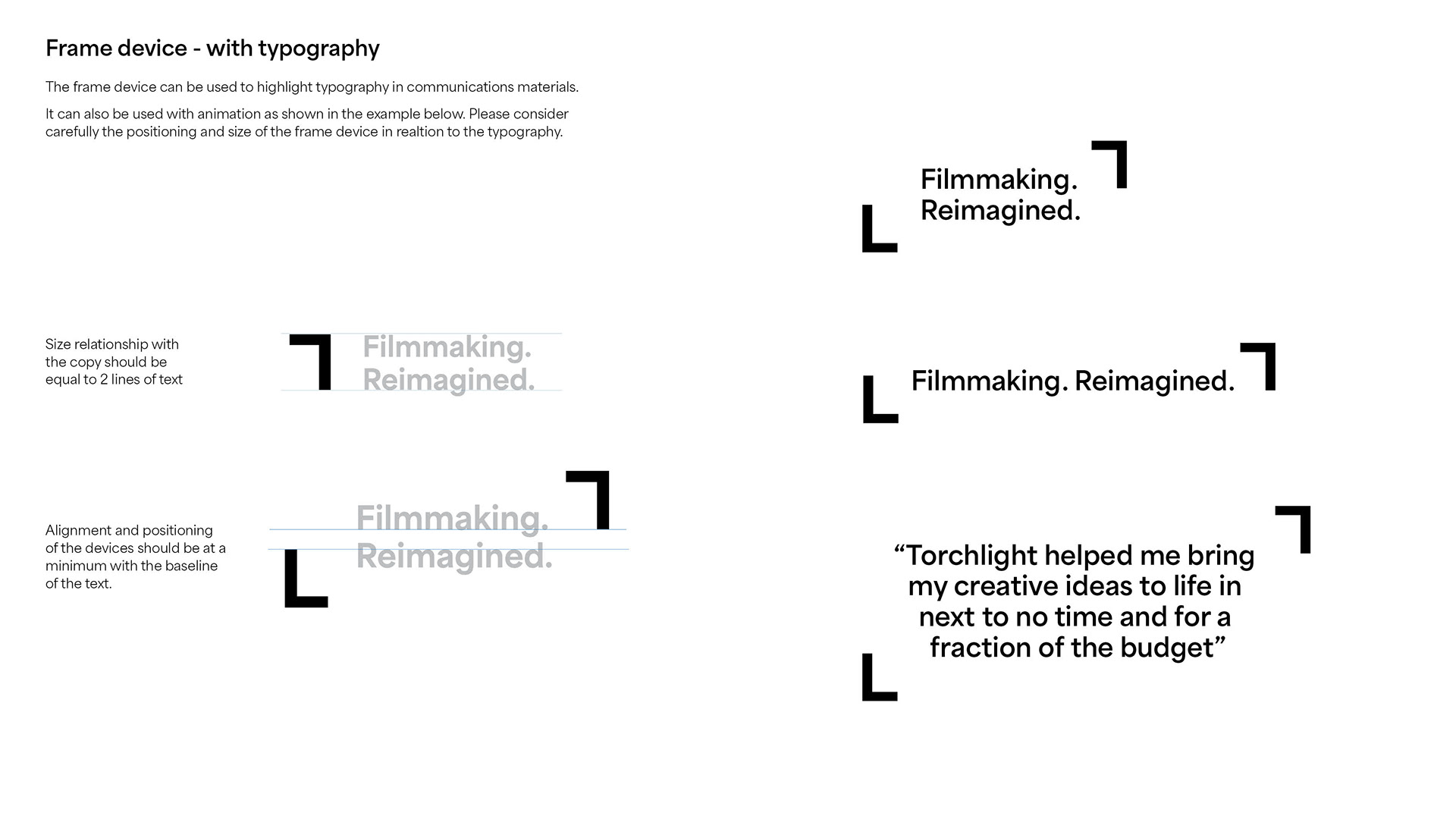 Comprehensive visual identity developed for Torchlight, an innovative Sony movie studio based in California, encompassing the full scope of brand design and execution. Central to the work was a brand concept inspired by the framing finger shapes directors use when envisioning a scene, translating this cinematic gesture into a distinctive visual language. The project included the creation of the logo and logo usage rules, establishment of typography and supporting branding elements, strategic implementation across applications, and the production of a motion logo that reinforces Torchlight’s creative and cinematic presence.